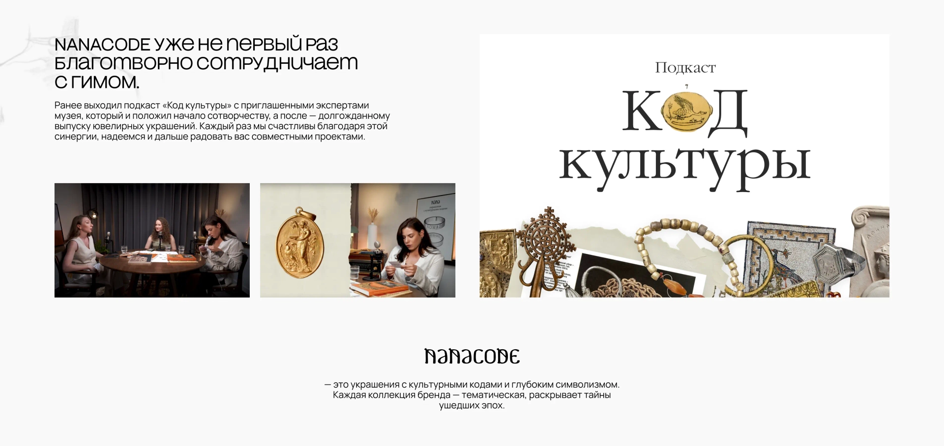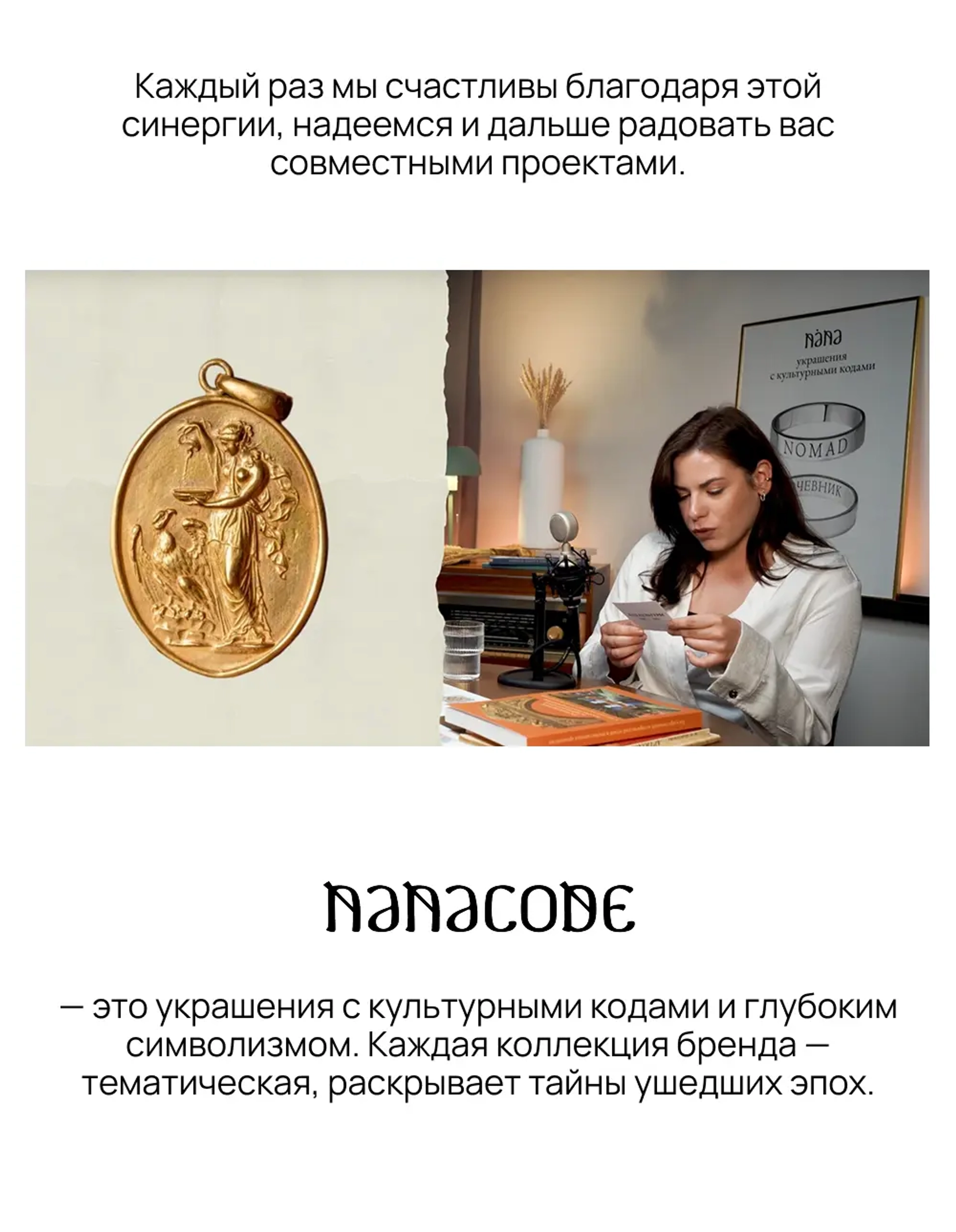 - Каждая коллекция NÁNA - это полноценное исследование. Мы изучаем культурные коды, узоры и орнаменты, символы и мифы древних народов и, вдохновляясь этим, создаем украшения. Если вы увлекаетесь культурой и искусством - вам будет у нас интересно.