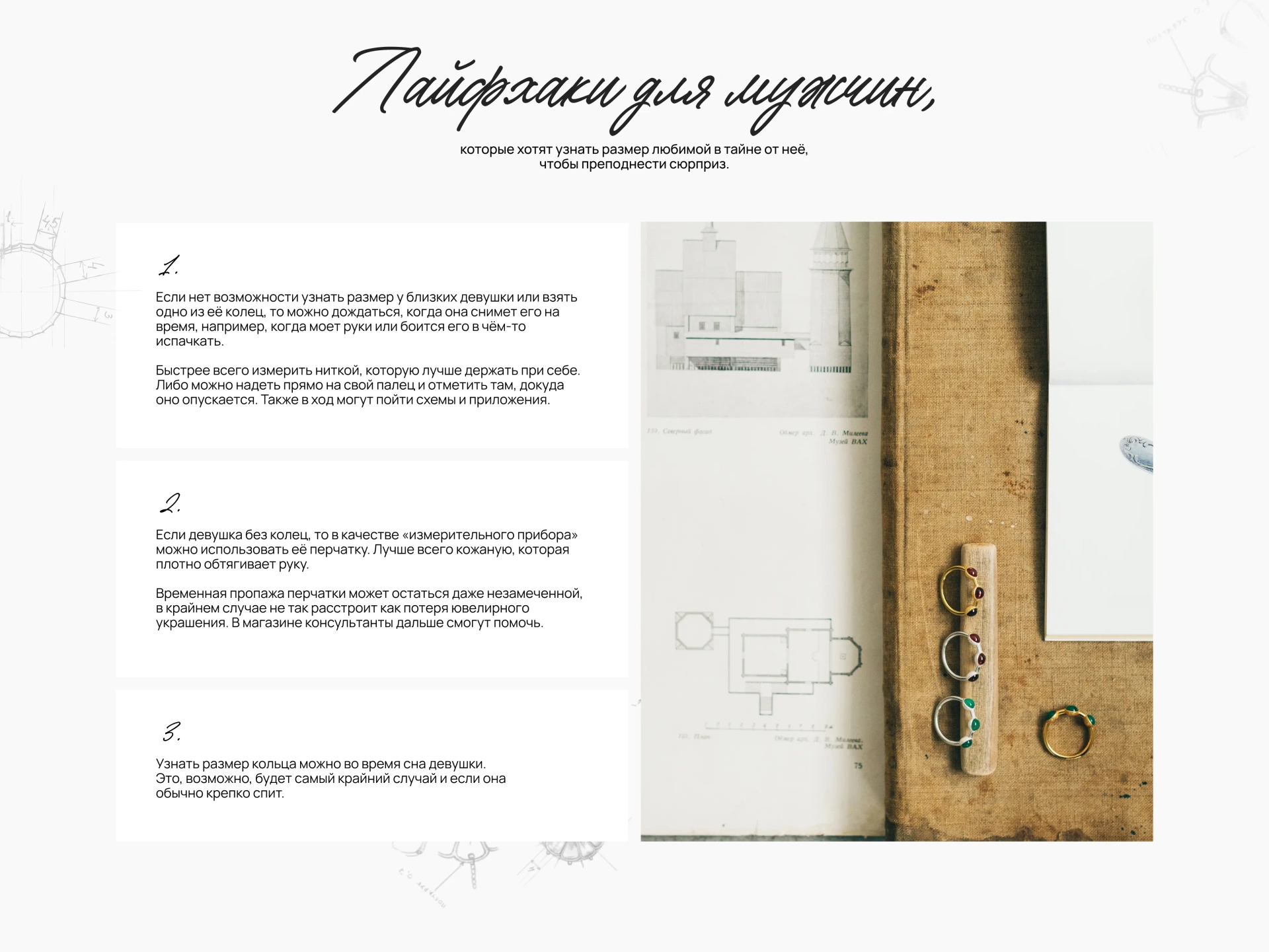 - Интерес к искусству и истории, ювелирным украшениям;