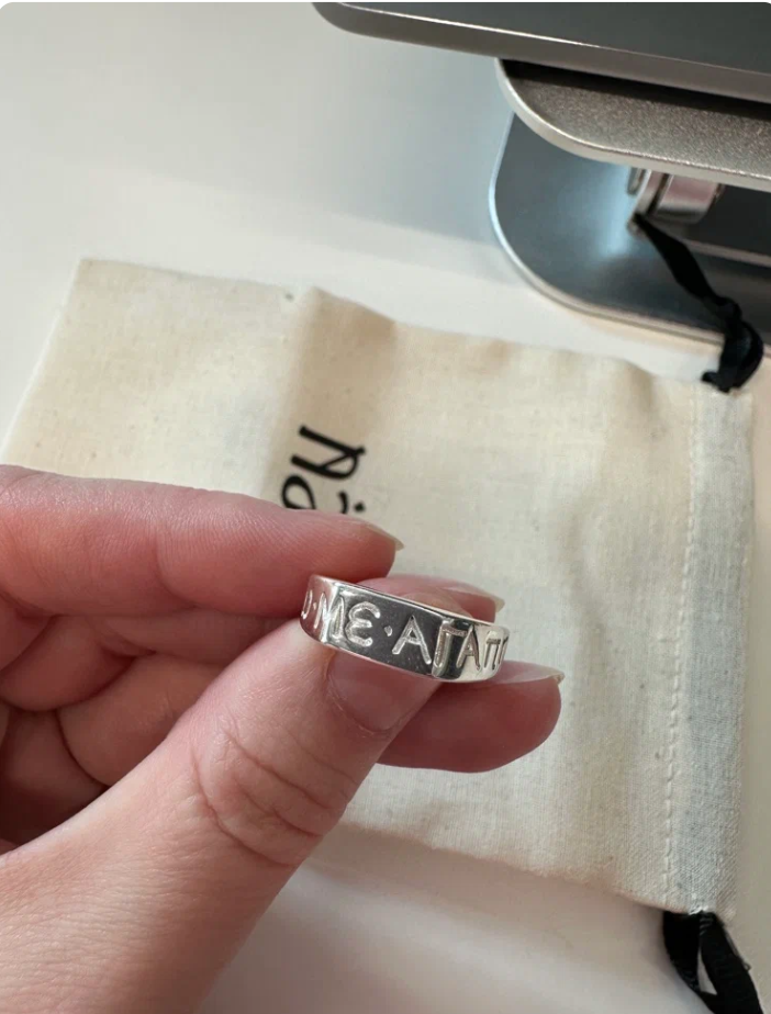 Это одна из новых версий нашего бестселлера — кольца-печатки с надписью на древнегреческом из коллекции KÓSMOS.