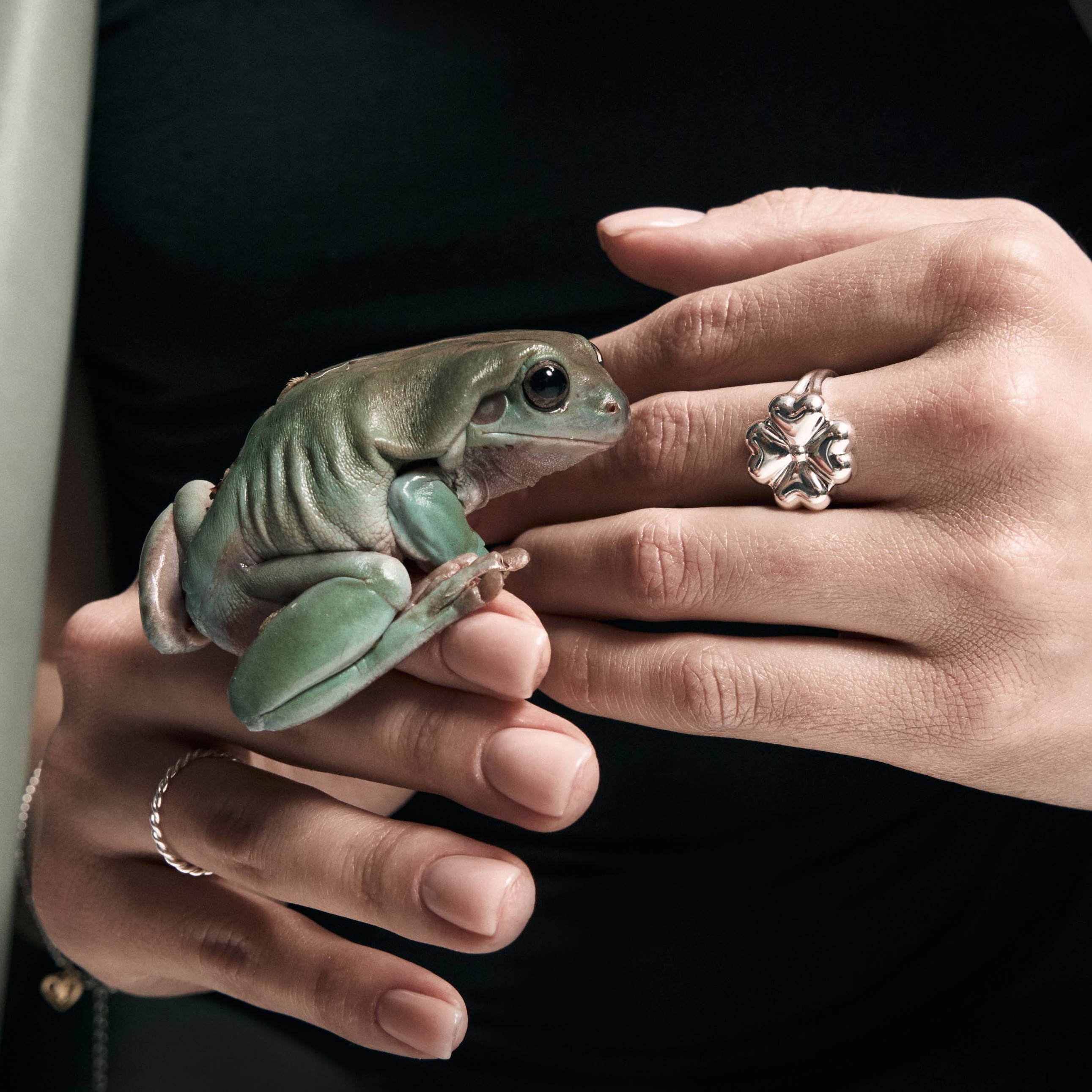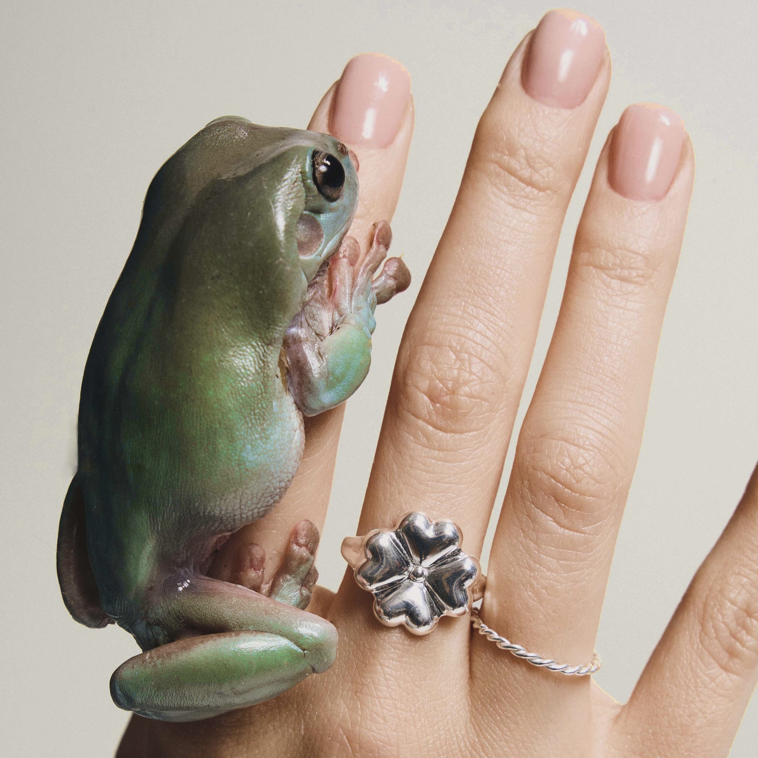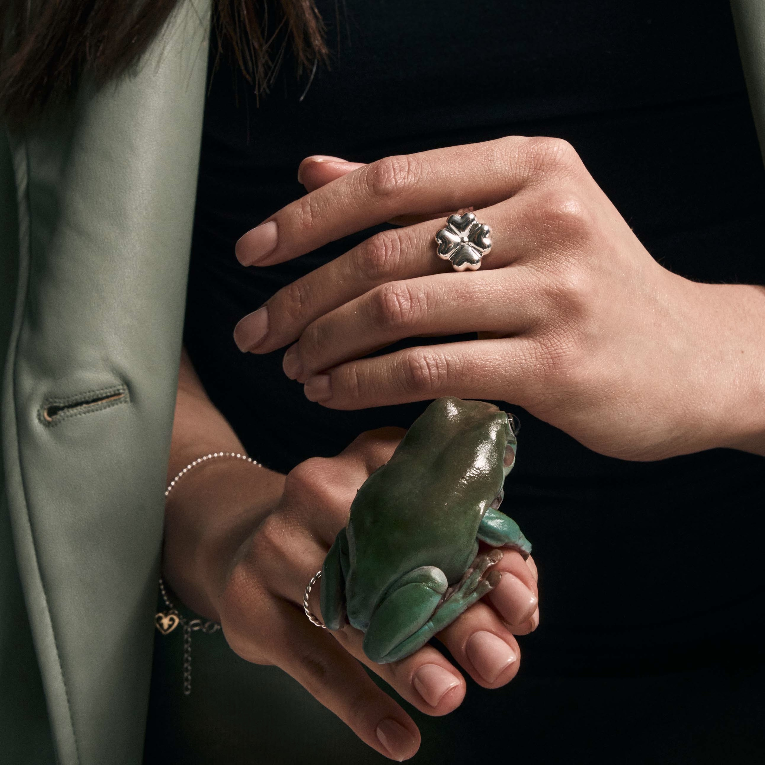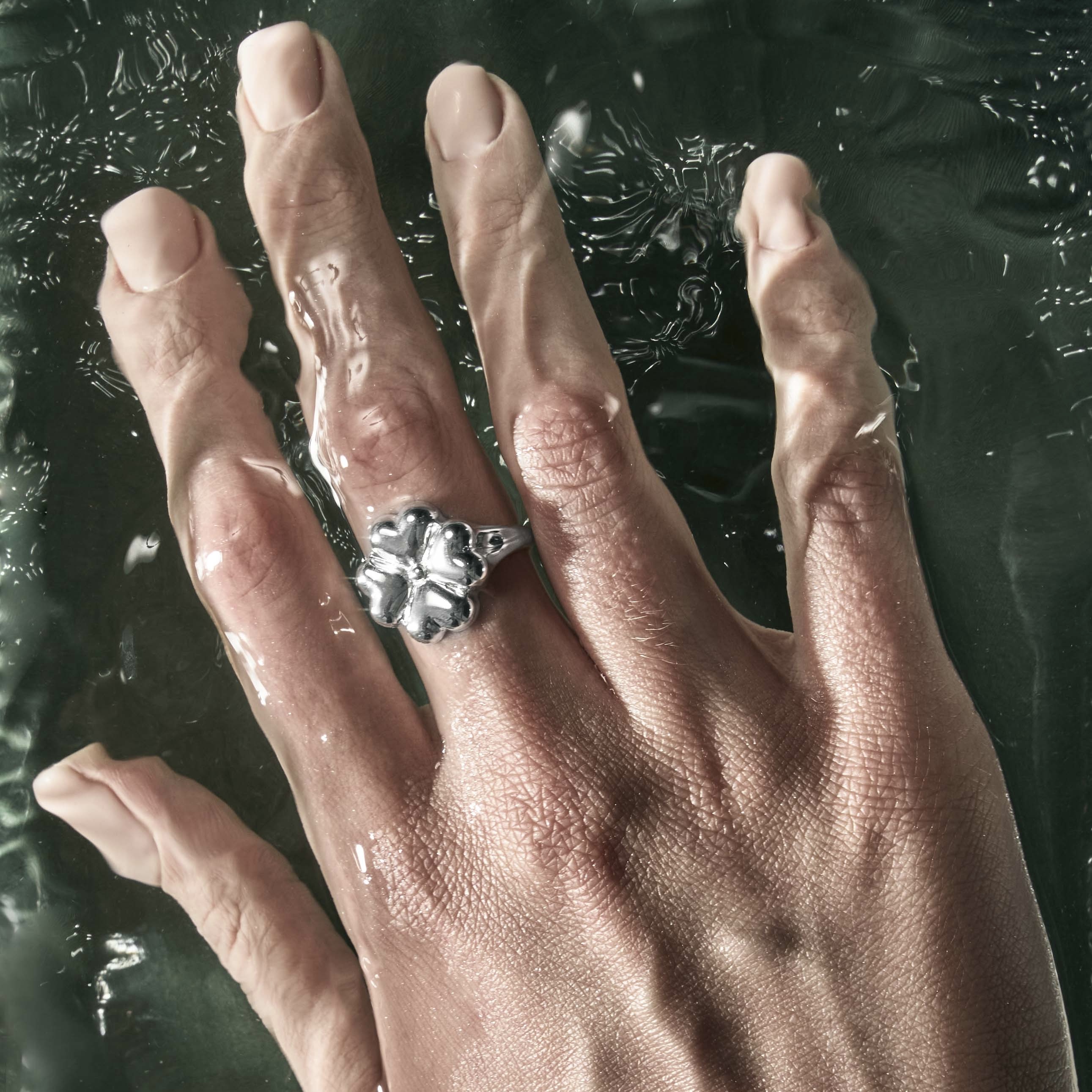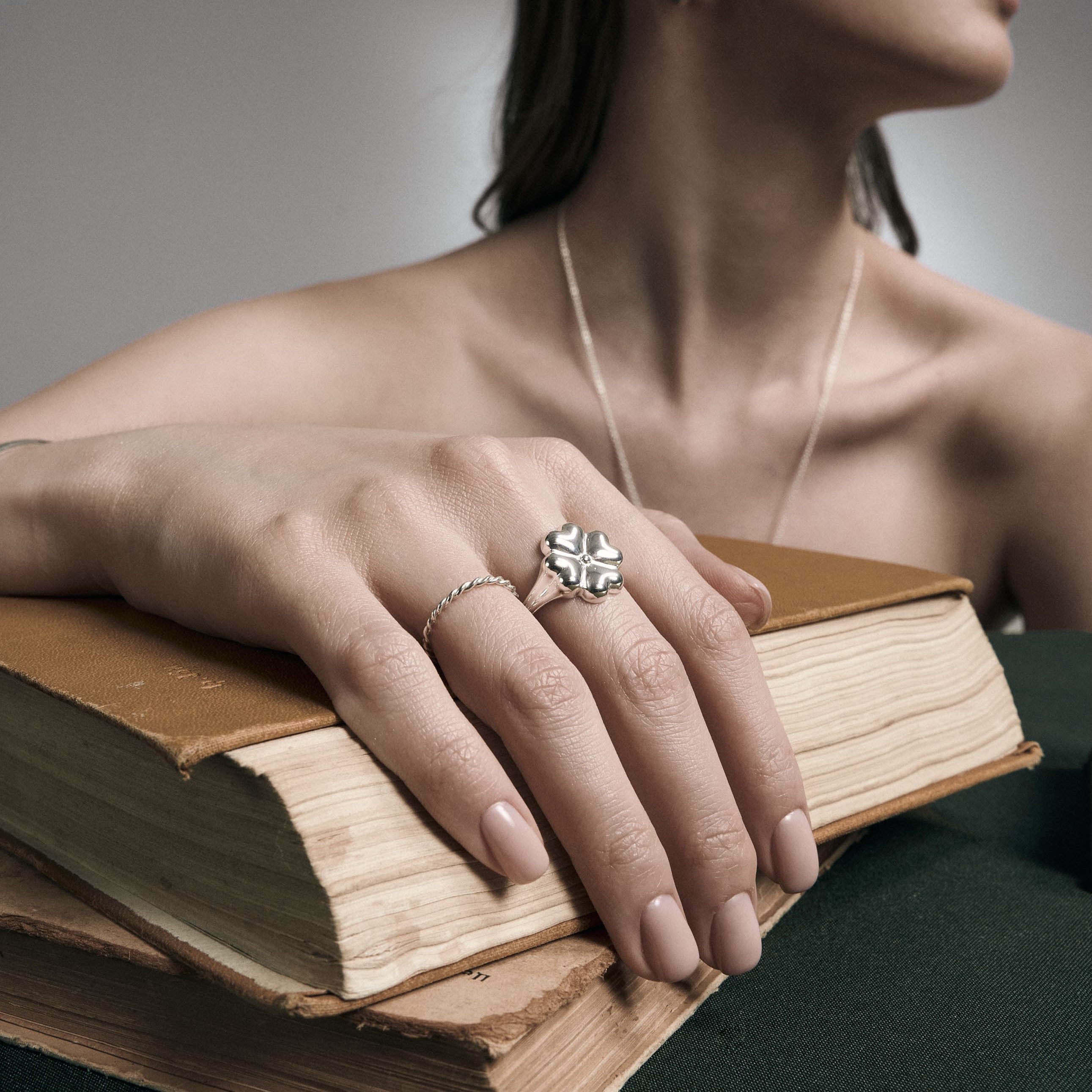 Цветок-четырёхлистник был популярным мотивом в византийских украшениях XII–XIII века. Подобные кольца обычно принадлежали состоятельным женщинам или представительницам городской знати. Историческую форму лепестков, напоминающих четыре сердца, мы выполнили в современной обтекаемой форме.